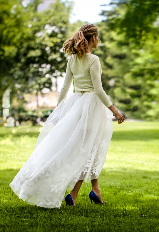 Con un bouquet di lavanda e spighe di grano, Charlotte porta i capelli raccolti, un velo dal gusto retrò ed uno straordinario vestito di Giambattista Valli composto da nuvole di chiffon delicatissime e decori finissimi interamente confezionati a mano. La parte alta del vestito, trasparente attorno al collo e con un finto scollo a spalle scoperte, ricorda in modo interessante quello scelto dalla madre, diversi anni addietro, per convolare a nozze con il primo marito Ernst di Hannover.