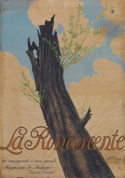 Passano alcuni decenni in cui l’attività cresce in maniera esponenziale, fortemente inibita però dall’arrivo della Grande Guerra sarà rilevata ormai sull’orlo del fallimento dal Senatore Borletti. Sono gli anni ’20 del ‘900 e mettersi al passo coi tempi è la primissima necessità per il nuovo proprietario, che decide così di affidare la scelta del nome dei primi grandi magazzini del lusso presenti su territorio italiano, niente meno che a Gabriele D’Annunzio. La Rinascente, semplice, chiaro ed opportuno – così definito dallo stesso D’Annunzio – è il nome che viene scelto per identificare proprio la rinascita del negozio. Nell’anno successivo vengono aperti diversi punti vendita, tra cui Torino, Roma, Firenze e Napoli. Il punto vendita principale, in Piazza Duomo a Milano, sarà oggetto di una imponente ristrutturazione che verrà però rimandata da un pesantissimo incendio che avrà luogo alcuni giorni prima dell’inaugurazione ufficiale. Dovranno passare altri tre anni affinché il palazzo sia finalmente pronto per essere inaugurato e per l’occasione, verrà elaborata dall’artista Aldo Mazza la locandina ufficiale.