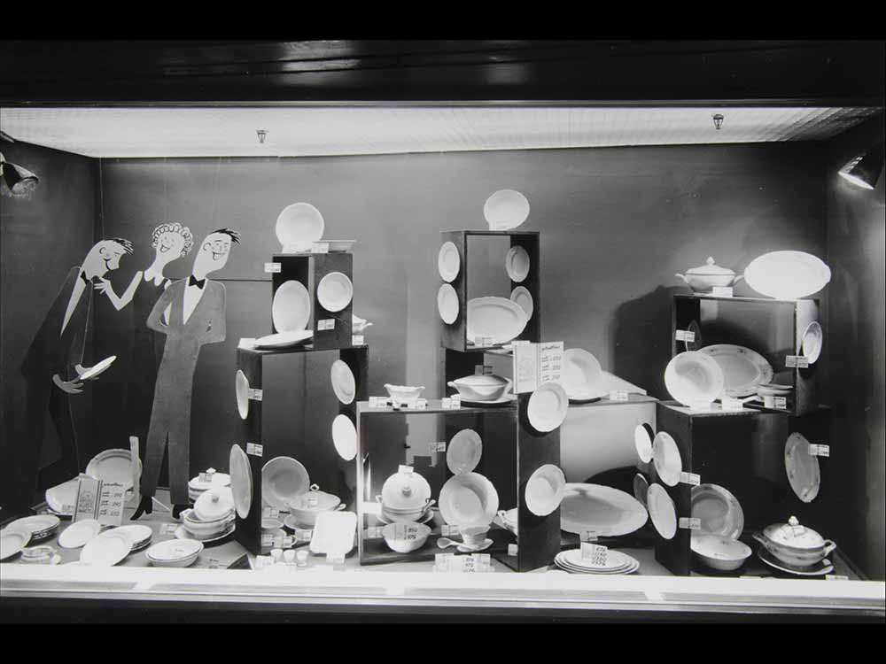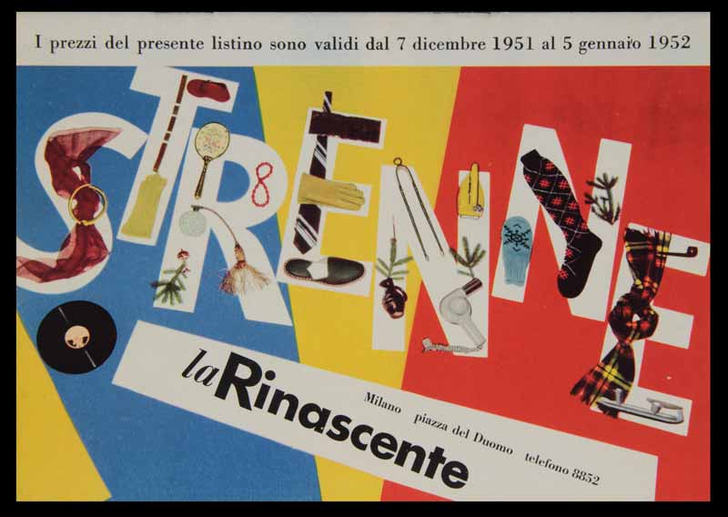 Ciò che renderà non solo efficace, ma famosa a livello mondiale Rinascente, saranno le enormi vetrine a cristalli, che oltre a permettere ai passanti di intravedere i giganteschi spazi all’interno, si trasformeranno in un vero e proprio spazio d’arte per l’esposizione creativa dei prodotti in vendita all’interno del negozio. Nell’allestimento delle stesse, Rinascente coinvolgerà talenti del design e dell’architettura; dalla moderna cultura visiva di Albe Steiner, il quale predilige l’impiego di materiali leggeri e facilmente componibili, alla ricostruzione puntigliosa di ambienti di Giorgio Pulici, dai giochi surrealisti di Bruno Munari all’artisticità di Roberto Sambonet, sino alle tante vetrine firmate da Ortelli, Iliprandi, Lanzani, Mariani, solo per citarne alcuni, per i più vari settori merceologici.