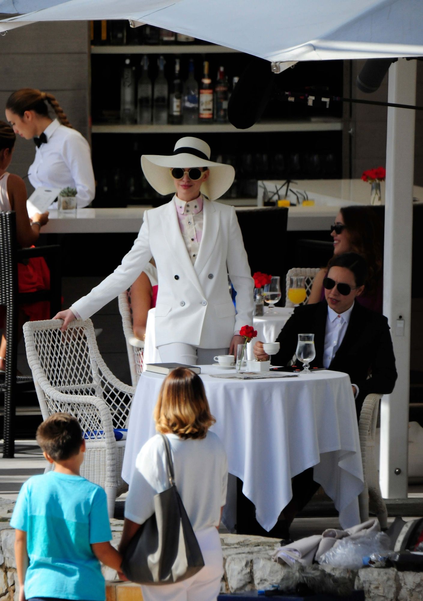 Partiamo col botto con il look che mi è piaciuto più di tutti in assoluto e che ha fatto sì che da due giorni a questa parte io non stia facendo altro che scandagliare tutti i siti di marchi di abbigliamento che conosco alla disperata ricerca di un completo come questo. Anne, o Josephine che dir si voglia, veste un set in maglia color panna composto da una gonna lunga plissè ed un maglioncino con collo a lupetto e maniche corte, che riporta sul davanti la ripresa del motivo plissè della gonna. L’abbinamento è d’obbligo con una Birkin di Hermes color cammello ed un paio di stivali scamosciati con tacco che in foto non si vedono (non sono riuscita a trovare online uno scatto che ne ritraesse la figura intera, mannaggia).